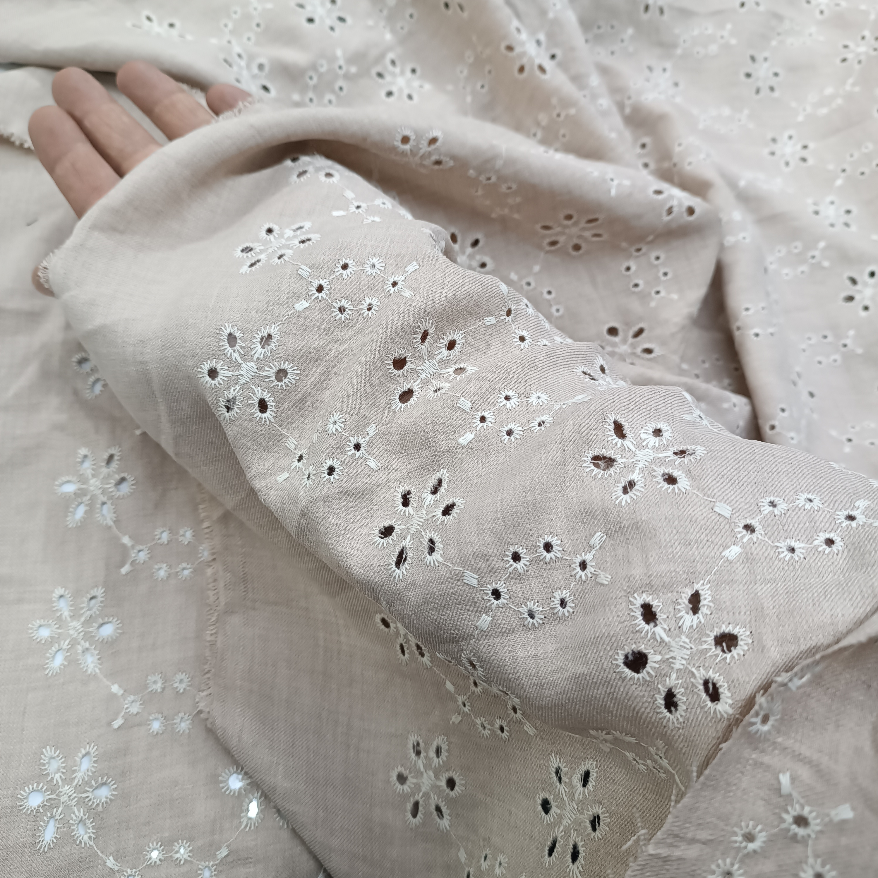 پارچه شانتون سوزندوزی ، عرض پارچه 150 سانت است ،سطح پارچه شبیه سوزندوزی و یا خامک دوزی است ، چروک و آبرفت ندارد ، مناسب دوخت کت ، شومیز ، خرجکار ،